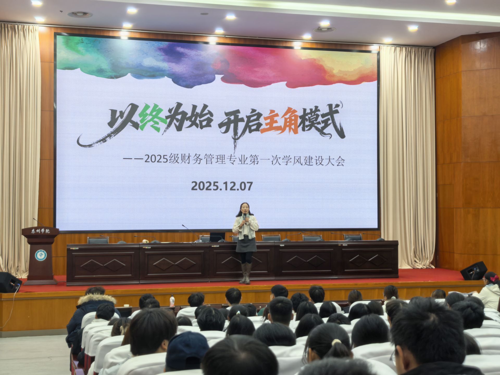 12月7日晚七点,2025级财务管理专业学风建设大会在行政楼1216举行。大会以“以终为始,开启主角模式”为题为新生提供前瞻性大学生涯规划指导,引导学生明确角色定位,激发个人发展内驱力。大会由辅导员吴慧老师主讲,全体2025级财管专业学生参加。